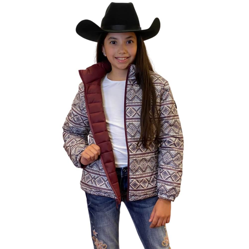 The soft feel of a lightweight puffer jacket with a more durable construction, plus it’s reversible! Two great styles in one with this stylish reversible jacket with printed Aztec pattern on the inside! Warm and comfy WarmTek Eco down filling. Your little girl will be protected from harsh weather conditions like cold wind and rain, this jacket helps keep the elements out
