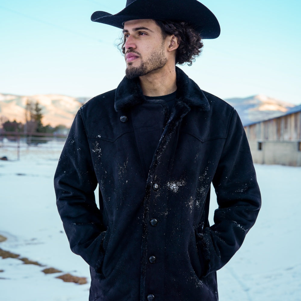 Unique Tempco Mens Marlboro Sherpa Coat. This Marlboro suede coat is inspired in vintage Western style and detailing that makes it one of a kind. Folded shearling effect and lied waist pockets with an aviator style collar and soft shearling lining. This faux shearling coat features a front zipper, snap buttons, a western style yoke on the front and back and Tempco logo on front left bottom.