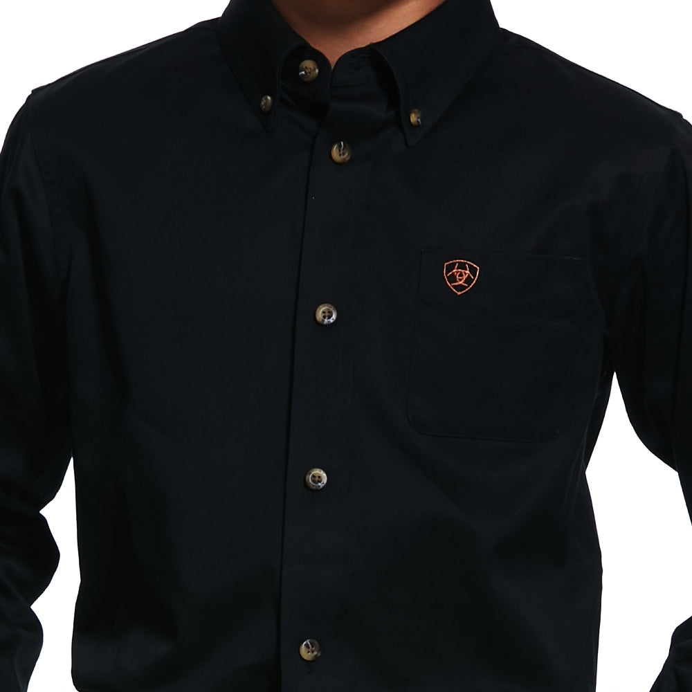 Essential Ariat Boys Solid Black Twilll Shirt. Straightforward, solid Western twill. Comfortable and tough, it features Ariat's specialized seam construction for unmatched freedom of movement.