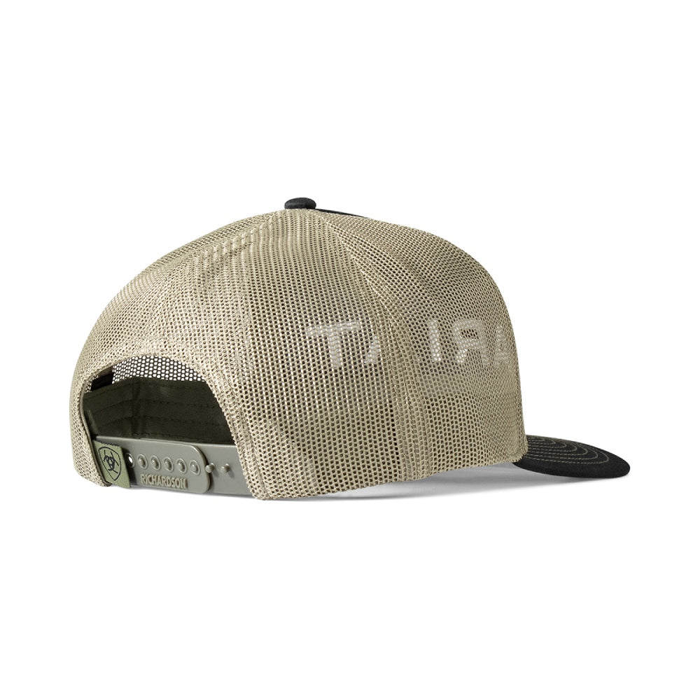Versatile Ariat Mens Black Embroidery Cap. Ariat mens cap by M&F Western Products. Black fabric with green stitching on the front panel and the bill. There is a pop-up Ariat word logo embroidered across the front panel in a green and yellow southwest pattern. Green mesh back and snap back closure for that perfect fit.