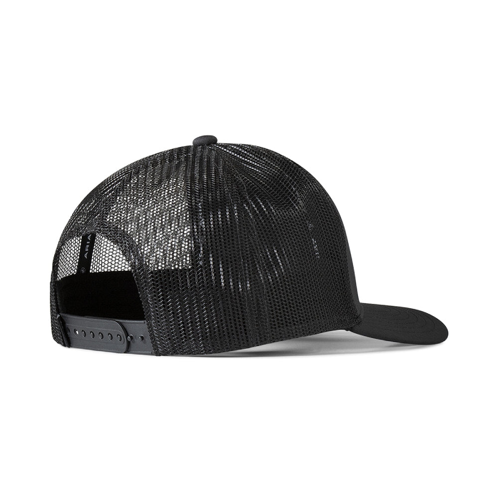 Essential Ariat Mens Black Snapback Cap. Ariat mens cap by M&F Western Products. Black fabric on the front panels and the bill. There is a metal Ariat shield with a floral engraved background on the front. Black mesh back and snap back closure for that perfect fit.