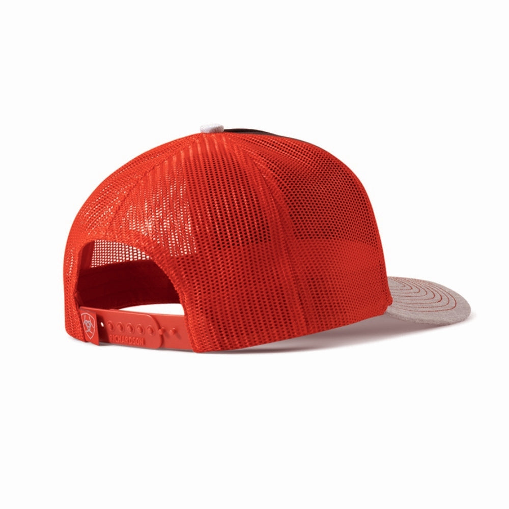 Authentic Ariat Mens Bronco Design Cap. Ariat men’s cap by M&F Western Products. Structured with black front panel and grey bill with red stitching. Ariat name printed in red on the front with bucking bronco design. Red mesh back. Snap back closure for that perfect fit.