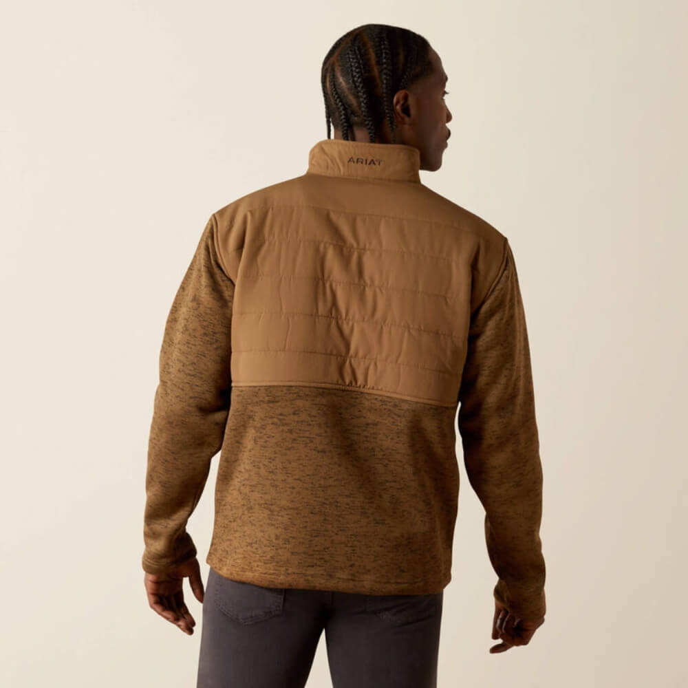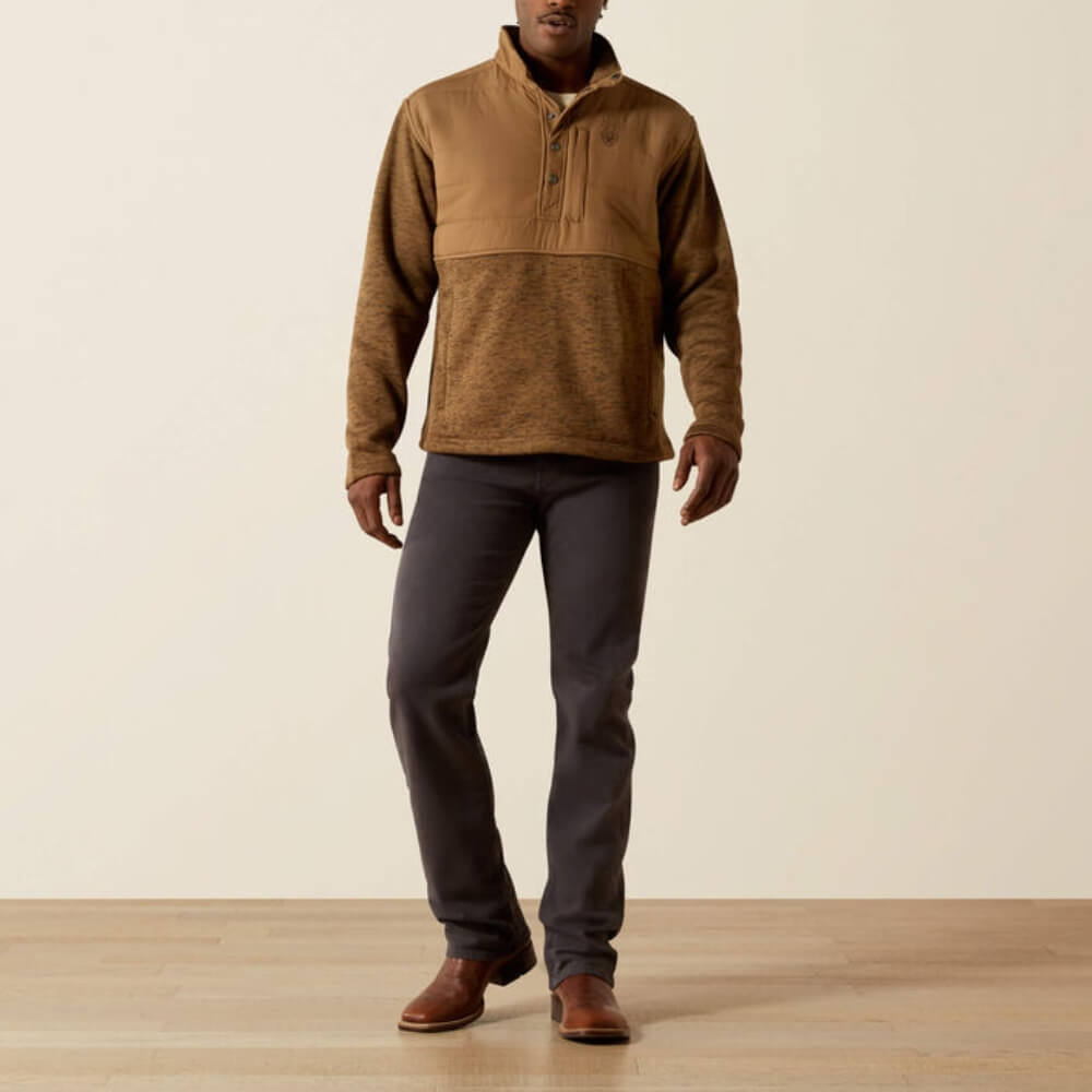 Comfy Ariat Mens Caldwell Reinforced Snap Sweater. A great layering piece, this easy-wearing pullover combines a modern silhouette with subtle outdoorsy vibes. The soft, sweater-fleece fabric gives it a sweatshirt-like feel, while the mock collar and slim fit keep it elevated.