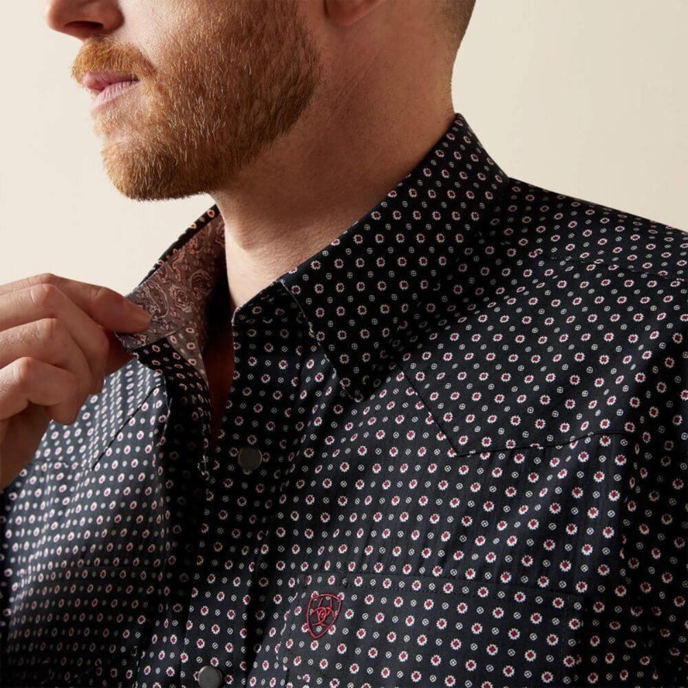 Handsome Ariat Mens Johnson Classic Fit Shirt Black. No need to break out the ironing board—Ariat’s wrinkle-free snap shirts look sharp and stay that way. With traditional Western styling, they're a comfortable, all-day, everyday staple.