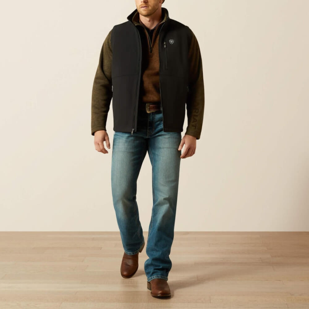 Classic Ariat Mens Logo Softshell Vest Black. An Ariat icon since 2003, Ariat softshells are a closet staple. They're warm, lightweight, and water resistant—and have plenty of stretch to keep you moving. With a sleek design and an Ariat logo on the back, this vest is versatile enough to wear just about anywhere.