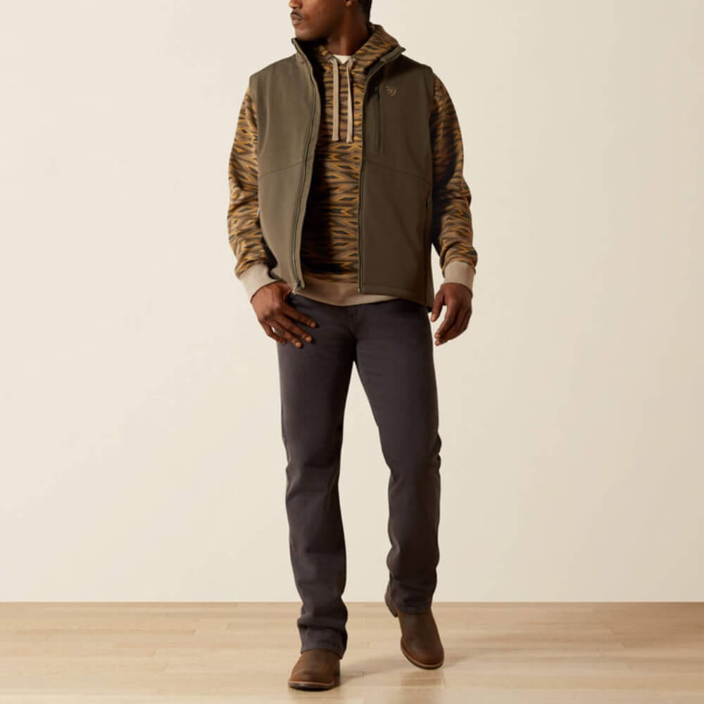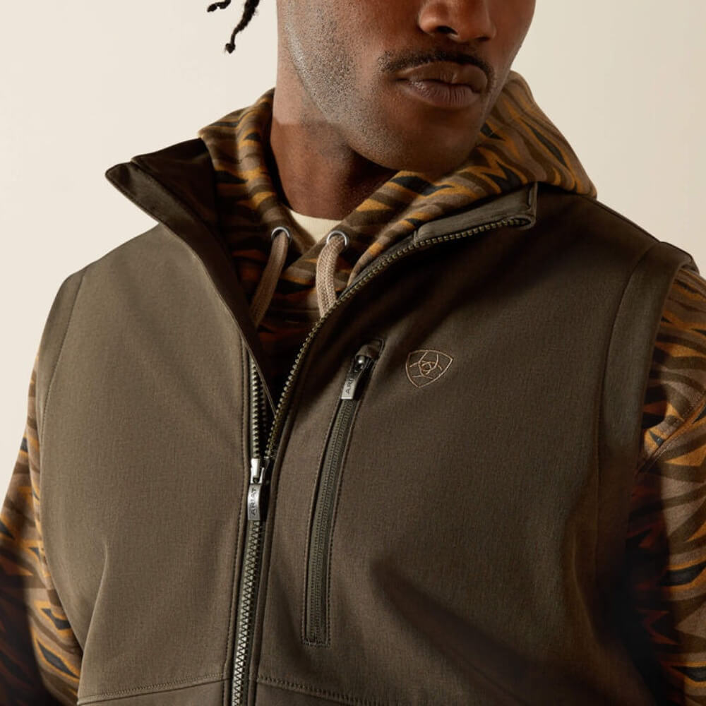 Handsome Ariat Mens Logo Softshell Vest Dark Green. An Ariat icon since 2003, Ariat’s softshells are a closet staple. They're warm, lightweight, and water resistant—and have plenty of stretch to keep you moving. With a sleek design and an Ariat logo on the back, this vest is versatile enough to wear just about anywhere.
