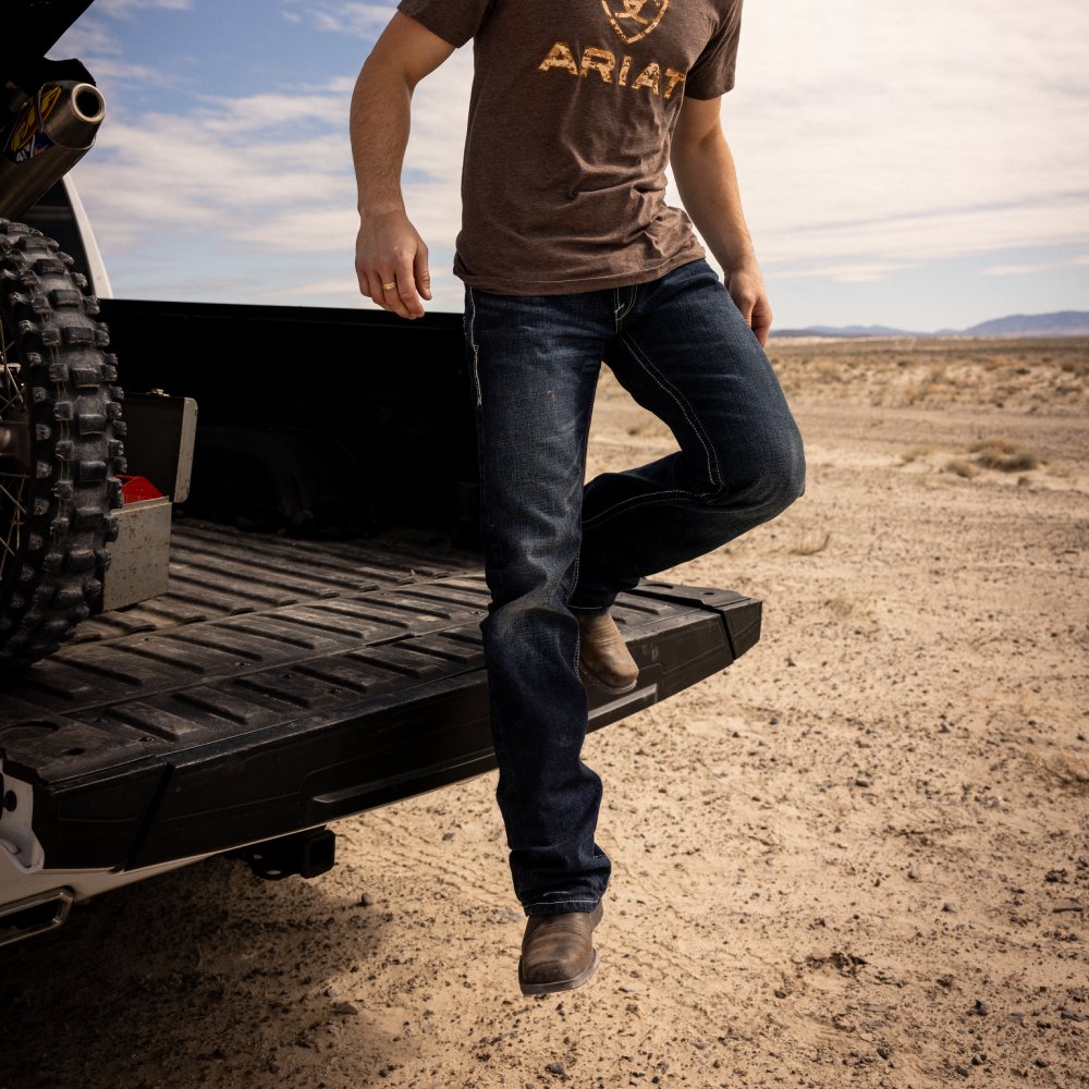 Essential Ariat Mens M5 Slim Jeans. Ariat jeans are essential for a today's modern cowboy. These M5 Slim Straight jeans offer a slim fit with a touch of spandex for maximum comfort. They also feature a medium wash color with five pocket styling and embroidery back pockets. Pair with boots for the effortless western style.