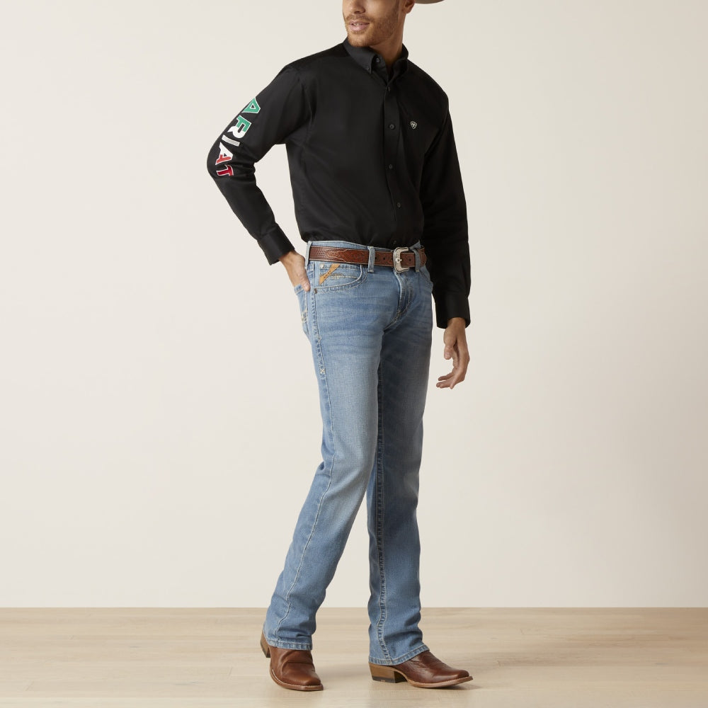 The Ariat Mens Mexico Long Sleeve shirt comes in solid Western twill. Comfortable and tough, it features our specialized seam construction for unmatched freedom of movement.