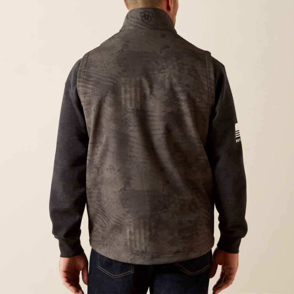 Unique Ariat Mens Patriot Flag Softshell Vest Phantom. An Ariat icon since 2003, Ariat’s softshells are a closet staple. They're warm, lightweight, and water resistant—and have plenty of stretch to keep you moving. This vest has a subtle Americana-meets-camo print to keep you from blending in.