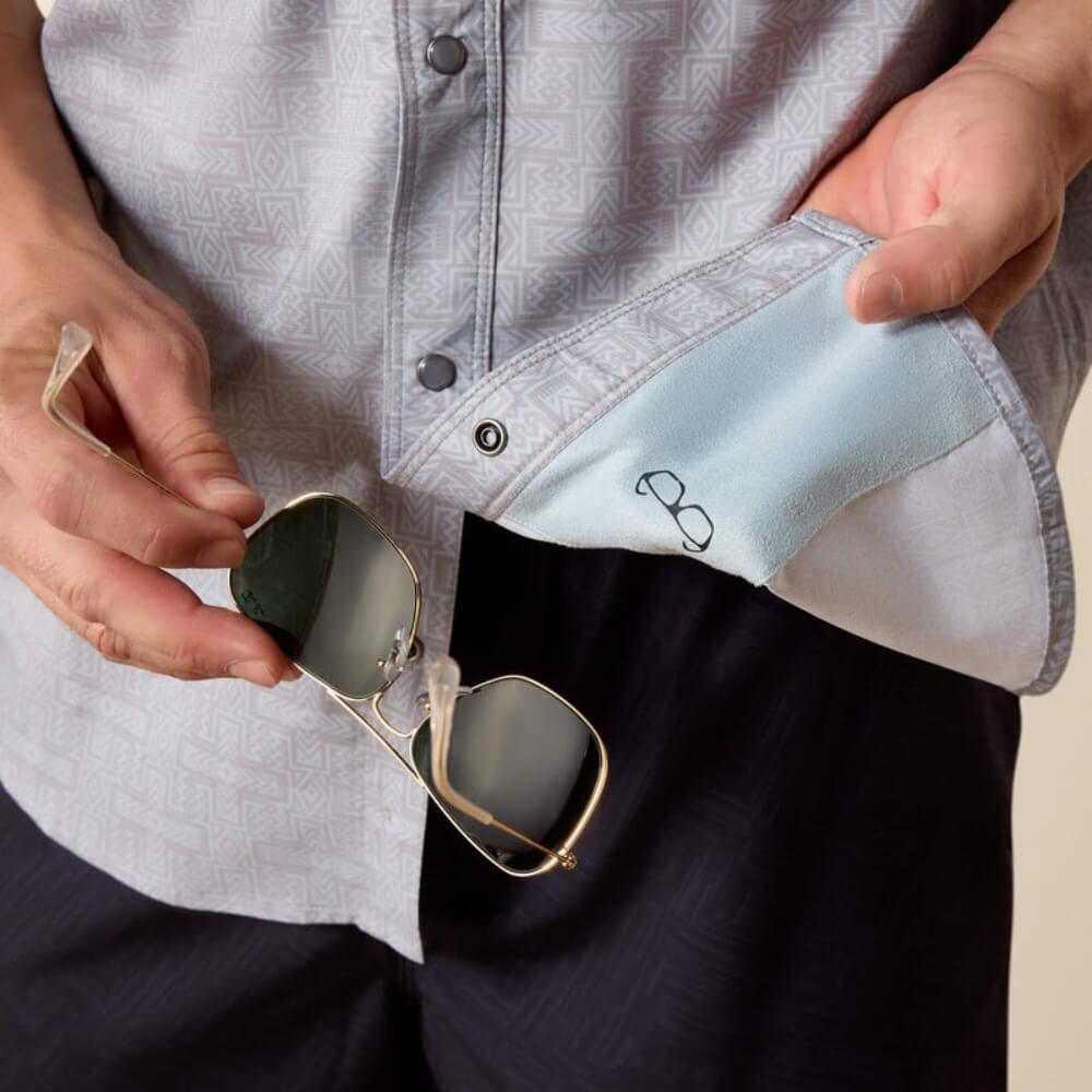 - Microfiber lens cloth is hidden in the hem for on-the-go cleaning