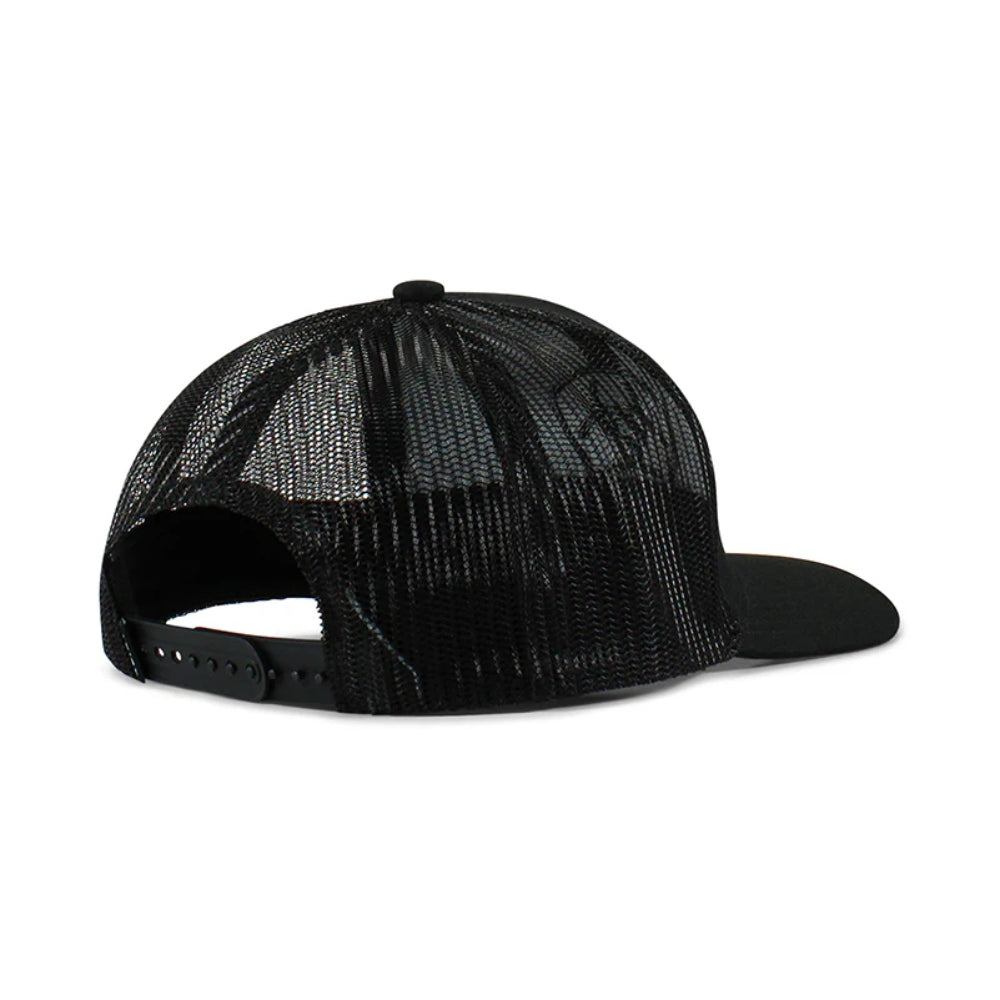 Black front panels and bill with embroidered shield logo in black. Black mesh back panels with snap back closure.