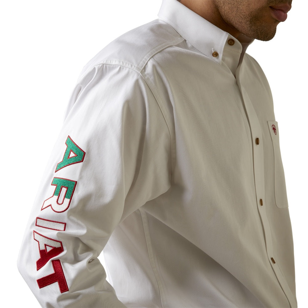 Unique Ariat Mens Team Logo Mexico Shirt. This isn't your dad's button-down. Ariat's Team Logo shirt looks sharp but wears easy. Made in a comfortable, durable twill, it has movement-friendly fit that doesn't restrict or constrict.