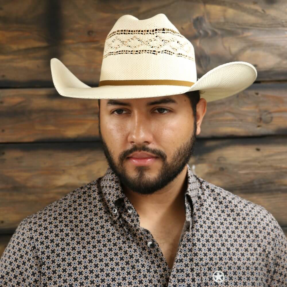 Essential Ariat Mens Weave Bangora Straw Hat. There is a 4 line golden tan band and an Ariat pin that finishes out this great look. You will reach for this quality and durable hat whether you are going to the barn or making a trip into town.