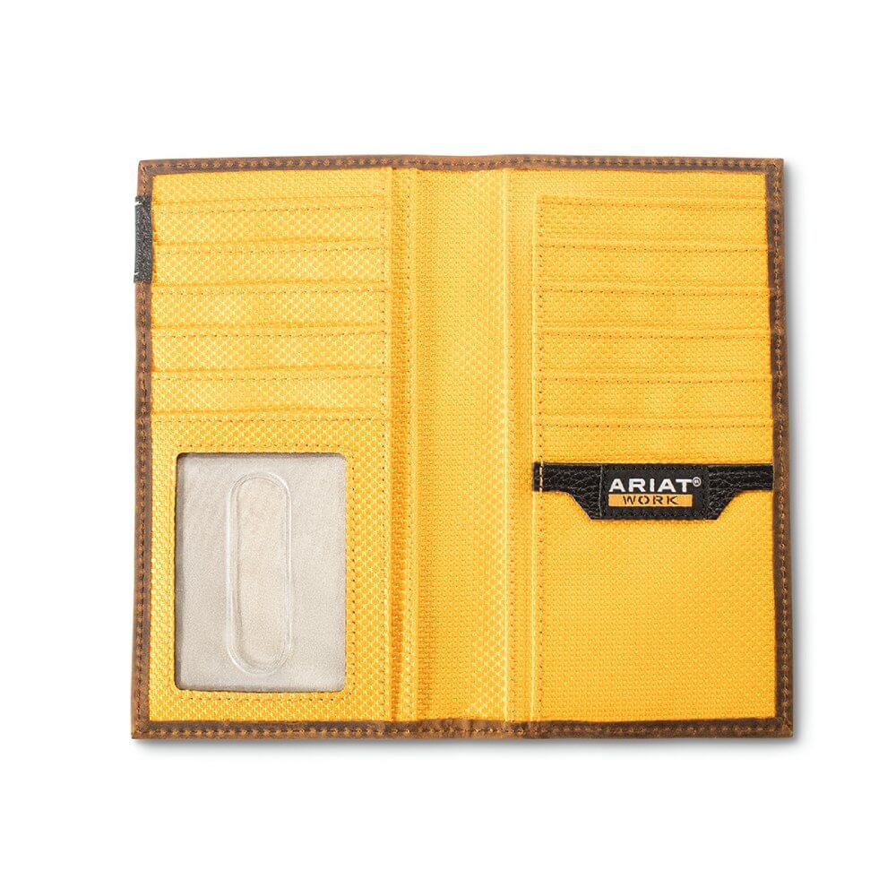 Durable Ariat Mens Work Checkbook Wallet Brown. This Ariat Work checkbook wallet by M&F Western Products features RFID blocking technology. Rebar orange recycled mesh interior. Top Grain leather exterior. Rugged silicone accent band with patch.