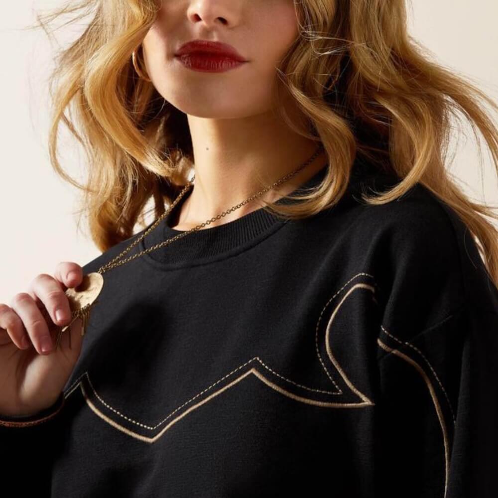 Authentic Ariat Womens Hickory Sweatshirt. Look cute, stay comfy in this fun embroidered sweatshirt. Whether layered over a shirt or worn solo as a top, it brings Western charm to any casual look.