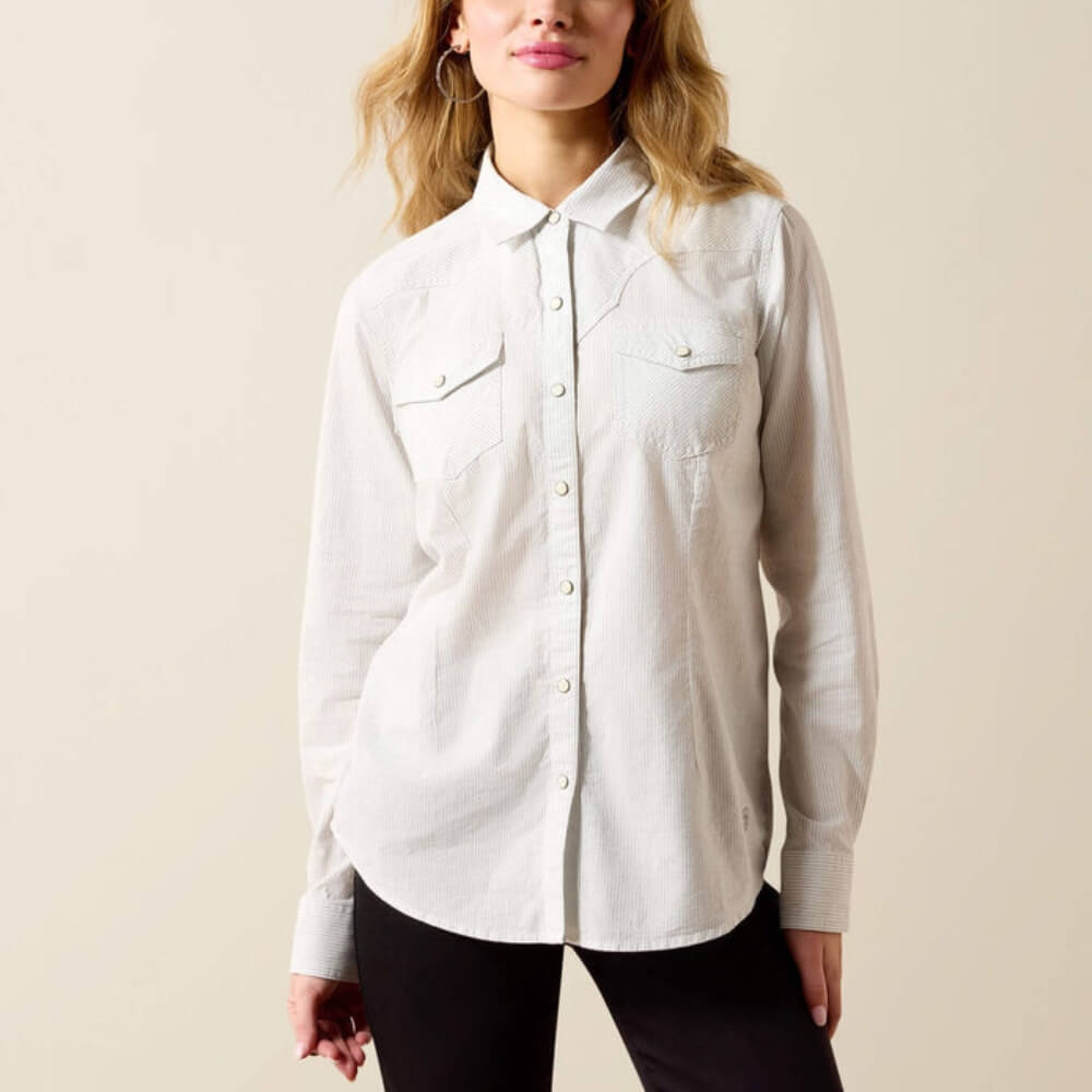 A wardrobe staple, Ariat’s snap shirt belongs in every cowgirl's closet. Authentically styled with pearl snaps and Western yokes, it looks good whether it's dressed up or covered in dust.