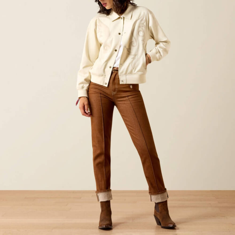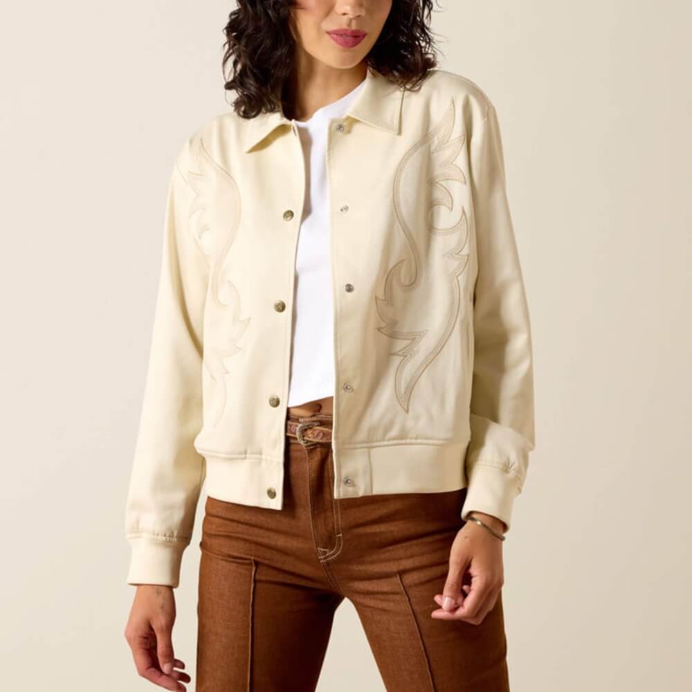 Meet spring’s statement-making layer. Neutral-toned but still a standout, Ariat’s Vaquero Bomber delivers the perfect blend of Western-meets-varsity style. Retro touches make it undeniably cool and an instant upgrade to any outfit.