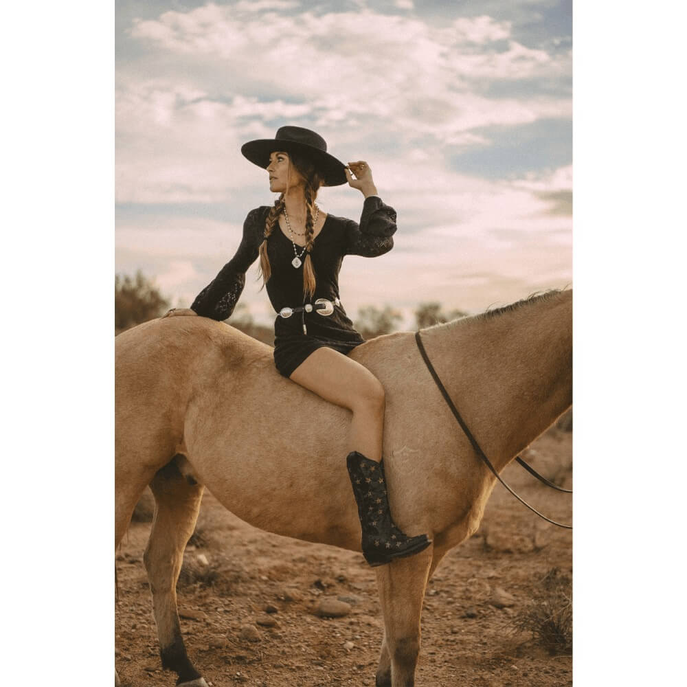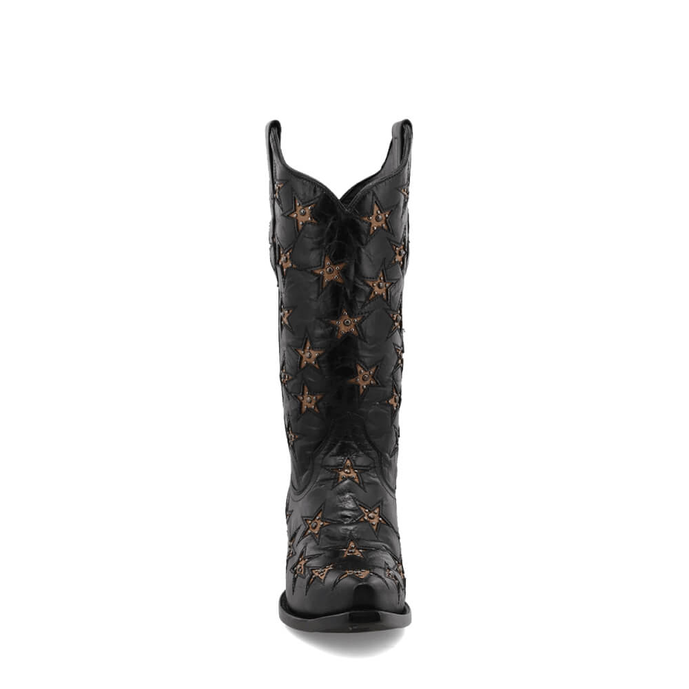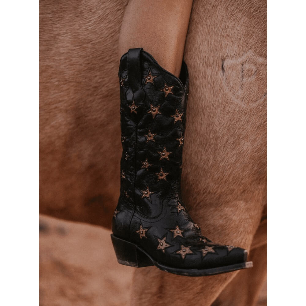 Unique Black Star Womens Marfa Leather Boots Black, Find comfort in the stars with this Marfa boot. Dressed in a beautiful black full-grain leather and adorned with gold inlay stars and studded embellishments, you are sure to turn heads in this showstopper boot. The Marfa features a 12" shaft height, 2" western heel, and snip toe for a sleek profile design. The Marfa is just as comfortable as it is beautiful thanks to a cushioned footbed and soft leather lining.