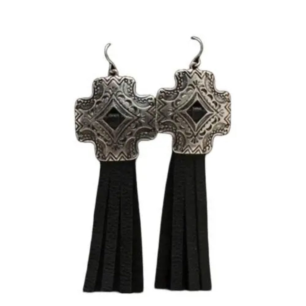 Blazin Roxx Womens Silver Cross Concho Leather Tassel Earrings - 30441