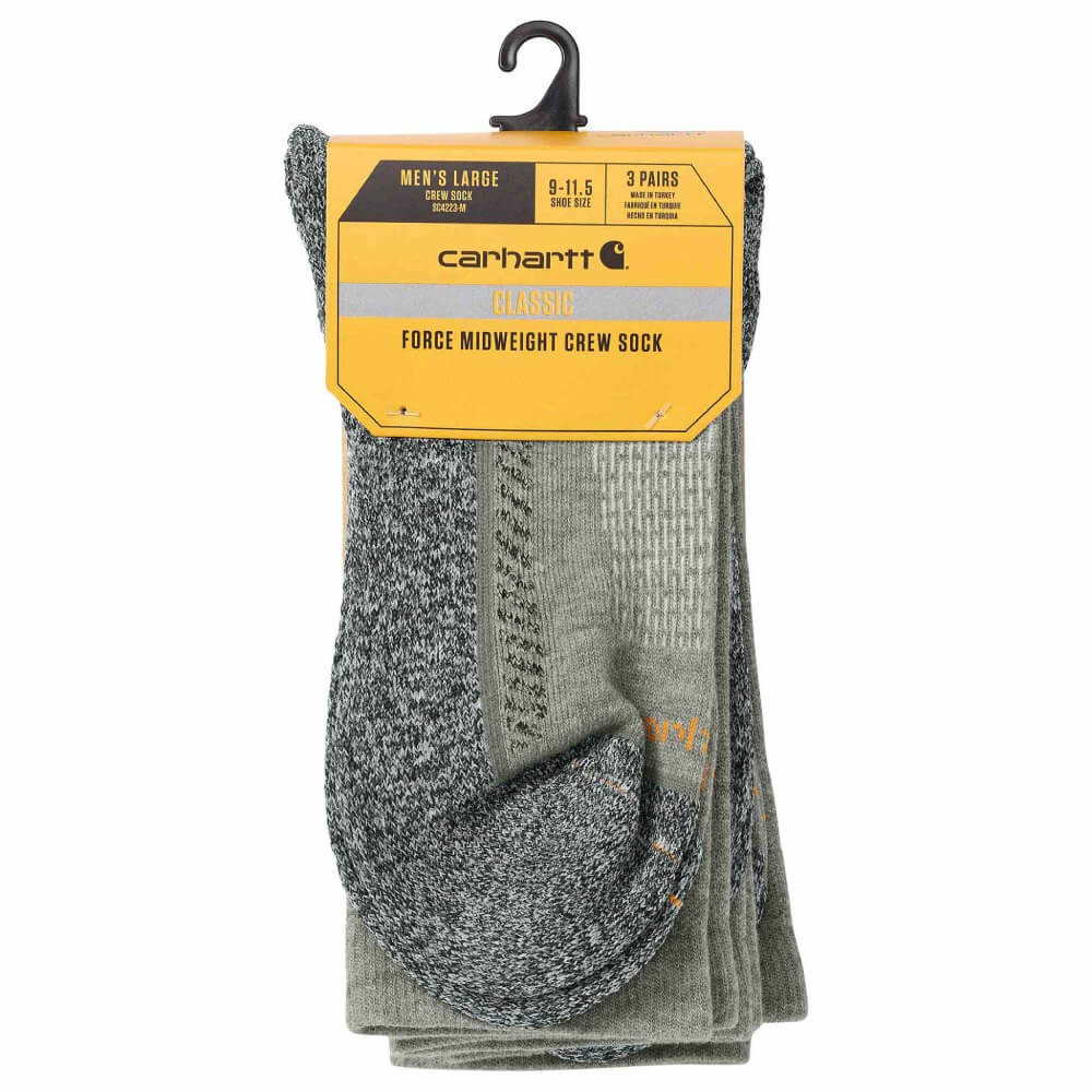 Comfy Carhartt Mens Crew 3 pack Socks. Everyday socks you can wear year round. These comfortable, mens crew socks are made of sweat-wicking yarn and have a reinforced heel and toe for durability. The reinforced arch and ankle adds support.