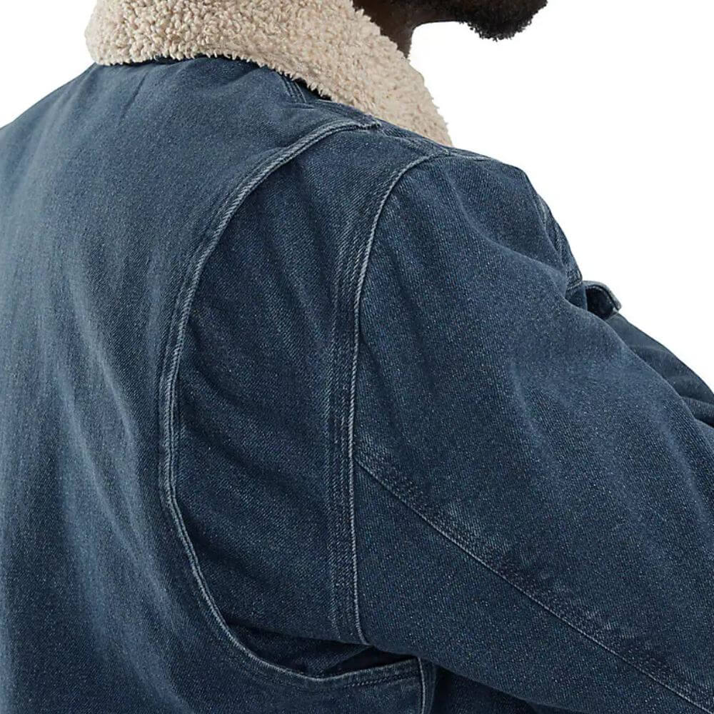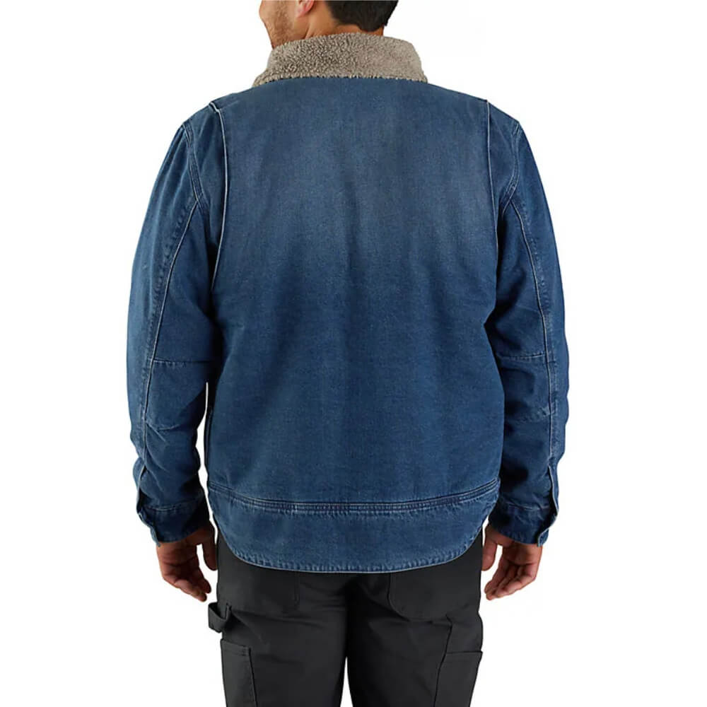 Durable Carhartt Mens Denim Work Jacket. Warmth Rating Earned: Level 2 – Warmer. Engineered For Midrange Warmth in Moderately Cold Conditions. Cool weather won't slow you down in this men's denim jacket. A relaxed fit and pleated back offers room to move while setting up equipment on the job or doing weekend chores. It's lined with sherpa fleece for added warmth. Pockets inside and out add plenty of storage.