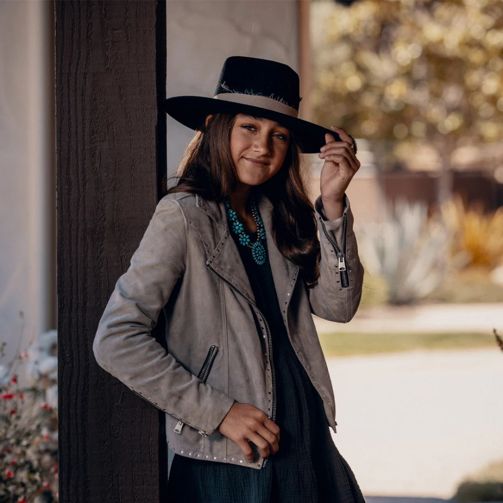 Lainey Wilson wrote “Lucky Me” when she was nine years old. In that spirit, they present the Lucky Me Jr. Youth Hat, a loving homage to talented young women everywhere. Part of their Charlie 1 Horse by Lainey Wilson Collection, this delightful firm-felt youth hat has an arrowhead crown with a 3 1/4" flat brim. A frayed ribbon with a faux-snakeskin band gives the Lucky Me Jr. extra personality, flawlessly accented by custom antique brass conchos and beaded detailing. The elastic sweatband stretches to accommodate size changes. Just like your daughter, the Lucky Me Jr. is something special.