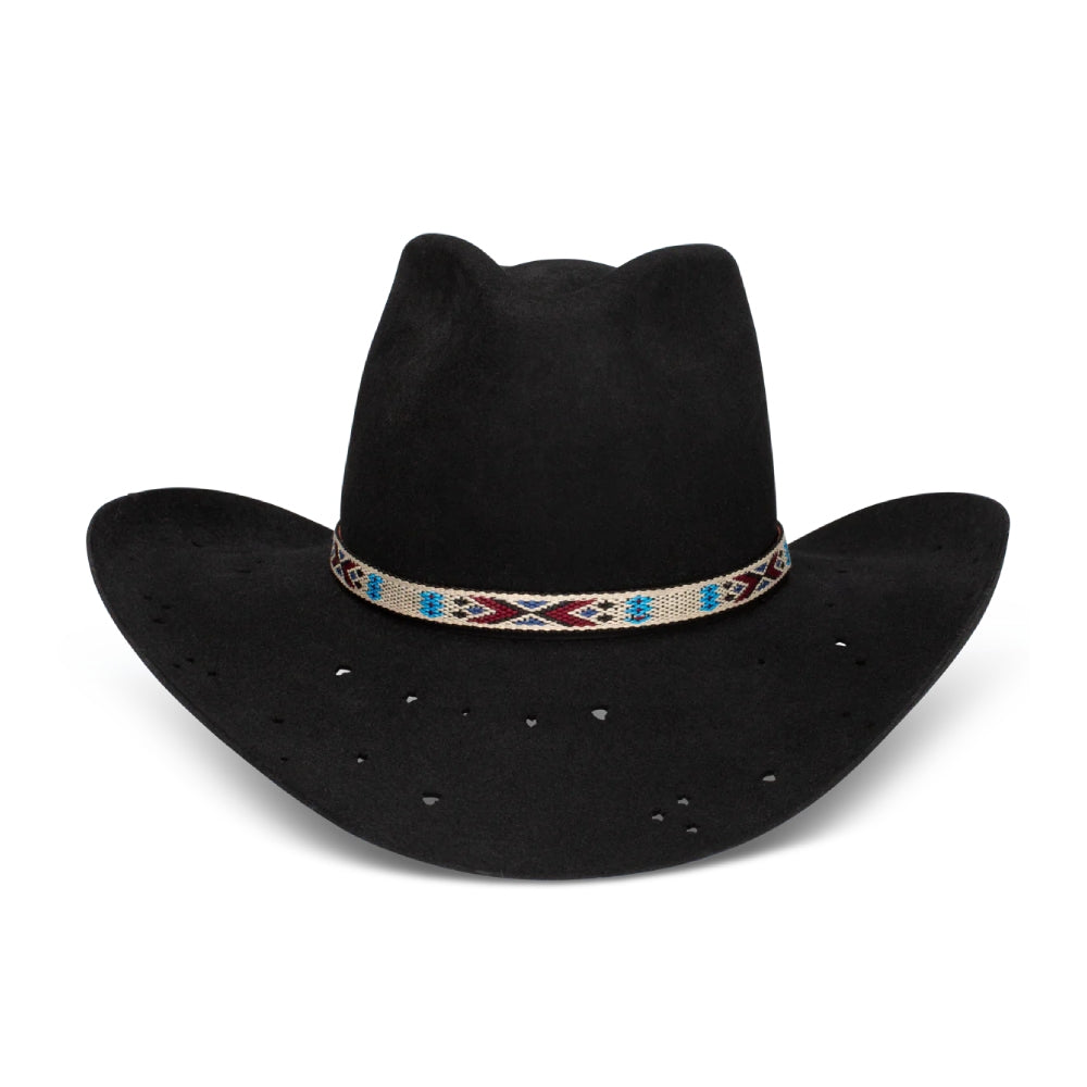 Unique Charlie 1 Horse Womens Wild Horses Hat. The handmade hatband features textured Southwestern patterning. A beaded tassel with an attached feather adds a daisy-like splash of beauty and style. A Dri-Lex sweatband adds a layer of comfort and wear ability. Get the Wild Horses in a sleek, eye-catching shade of black.