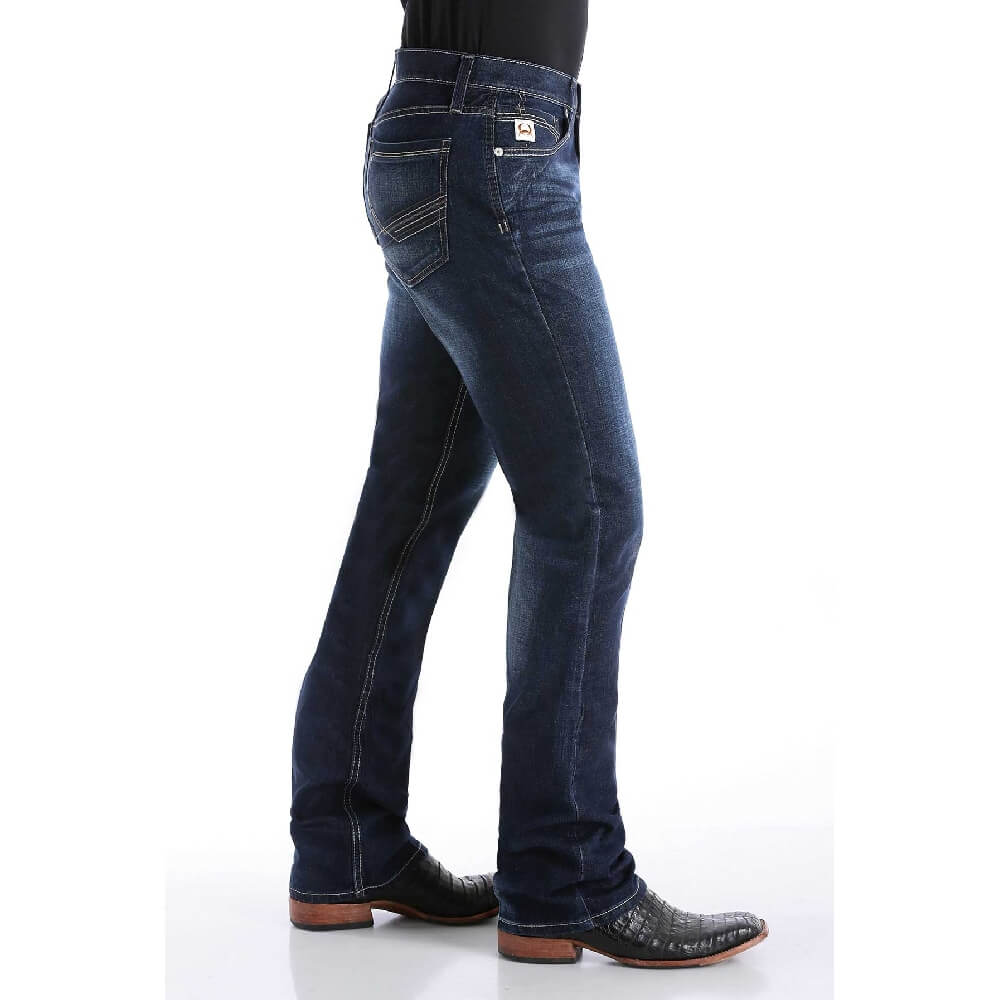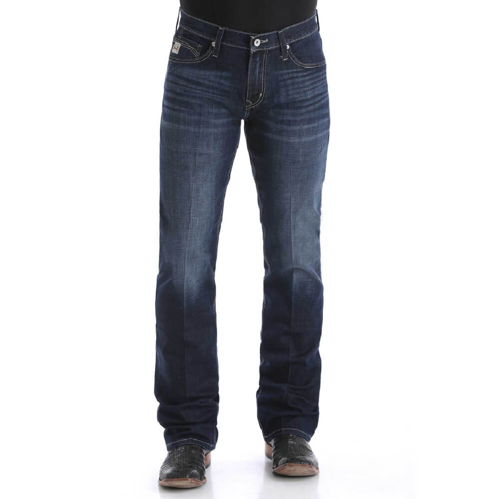 Essential Cinch Mens Ian Bootcut Jeans. The IAN brings forth a modern finish with hand sanding, whiskers and knee starbursts. Embroidery in shades of charcoal and taupe zig-zag across the back pockets, while antique pewter burrs compliment the front. With a 10.9 oz. performance denim and a distinctive wash, this jean is the clear-cut choice for optimal athletic performance.