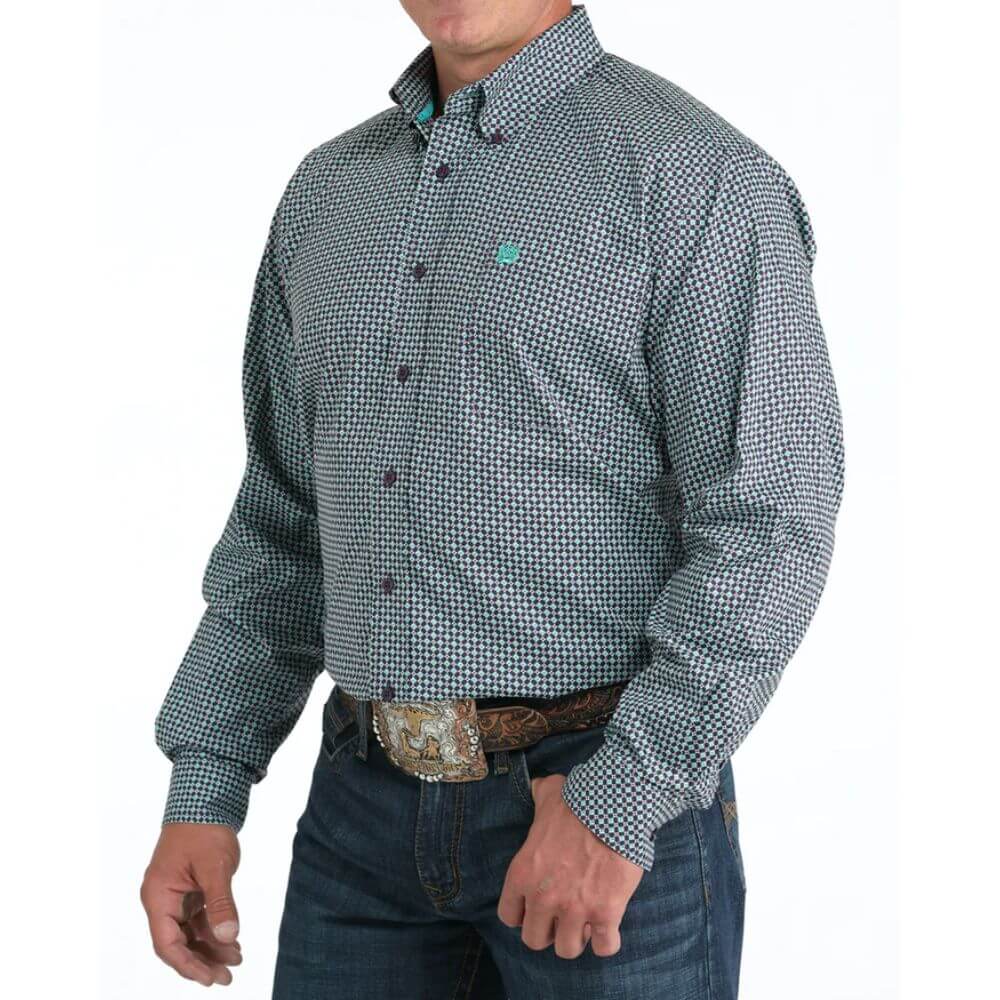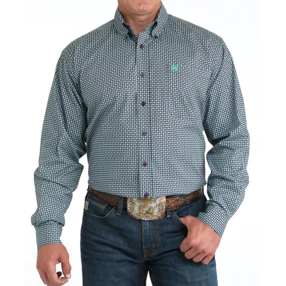 Handsome Cinch Mens Stretch Western Shirt. This purple printed stretch friendly cotton-spandex plain weave by Cinch is engineered to deliver high performance any day of the week. Design features include an open left front pocket, embroidered logo, and purple buttons.