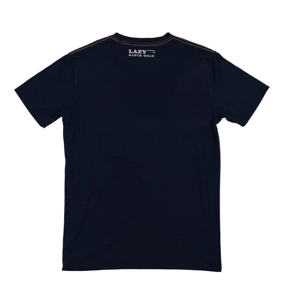 Essential Lazy J Mens Built To Last T-Shirt Navy. Introducing the Lazy J Ranch Wear Built to Last T-Shirt in Navy, a perfect combination of durability, style, and comfort. The classic navy color provides a timeless look that pairs effortlessly with any wardrobe.