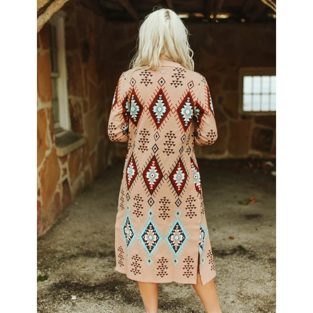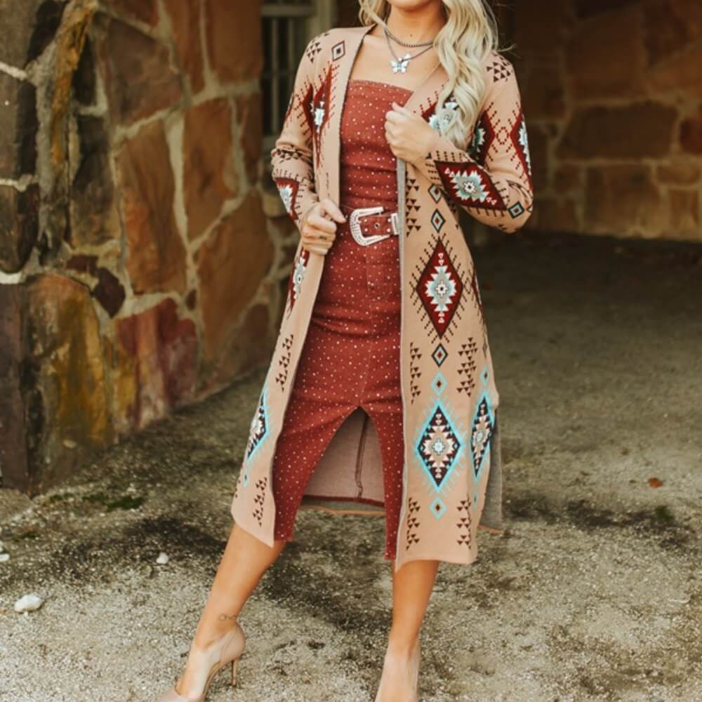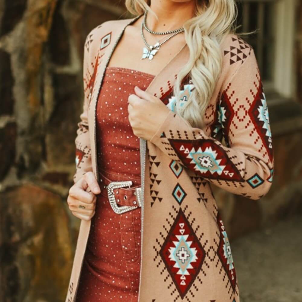 Wrap yourself in bold, rustic charm with this wine-colored Southwestern patterned duster cardigan by Lucky & Blessed. Designed with eye-catching tribal-inspired diamond motifs in turquoise, cream, and soft blue, this open-front knit layer radiates Western heritage with a modern twist. The mid-calf length and side slits offer easy movement, while the soft, textured knit ensures cozy comfort for every season