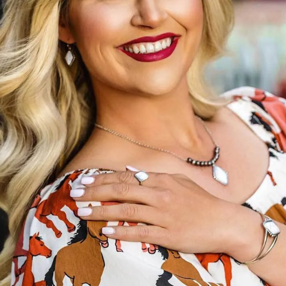 Start every day with the Blank Slate Open Ring. This ring features an ethereal White Buffalo stone. The diamond shaped stone is enclosed in a silver tone beaded border. This ring will become a staple in your wardrobe. One size fits most.