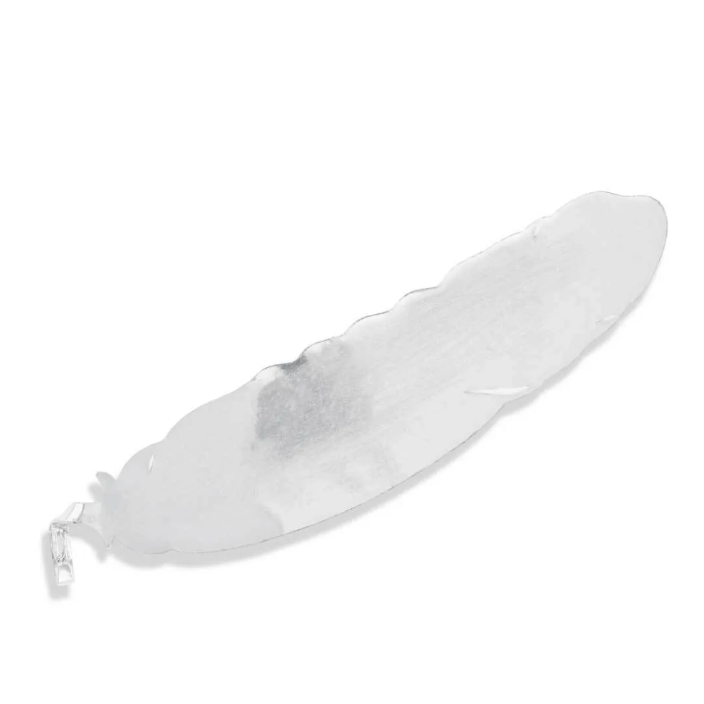 Patriotic pride in our completely innovative Hat Feather! Finished in a bright silver, this feather is engraved to mimic the beauty and irregularity of a natural feather, with sections and little swirls that add character and interest for this piece. This classic hat feather has red, white, and blue stars and strips down the main vane. The trademarked fastening system will secure onto most hat bands.