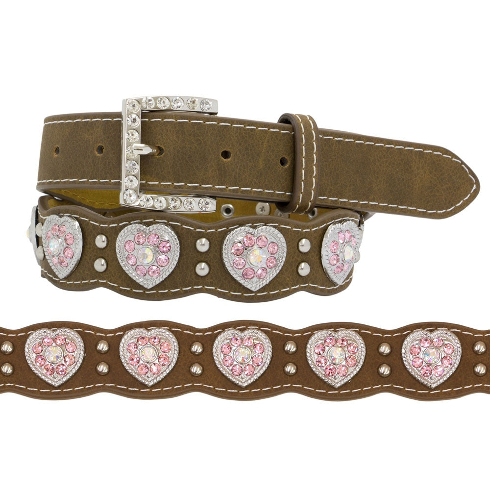 This kids belt by Nocona has a brown scalloped strap with pink rhinestone heart conchos and silver stud accents. Comes with a silver buckle with clear rhinestone accents. The buckle is detachable to be replaced by your little Cowgirls very own buckle.