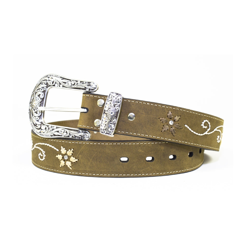 This ladies Nocona belt is definitely fashion forward. Each embroidered flower is accented with a delicate rhinestone center giving this belt the perfect blend of county simplicity and stylish bling. The removable buckle makes it costomizable for your favorite buckle. Perfect belt for any pair of jeans.