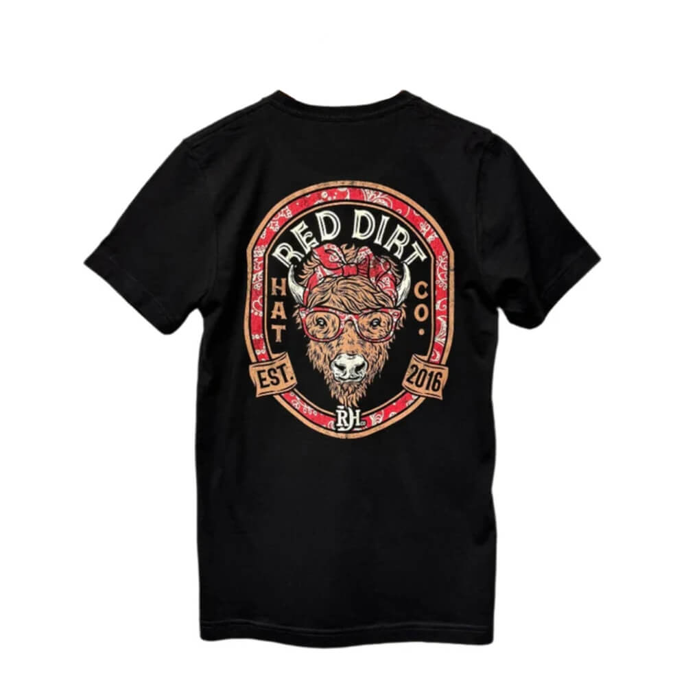 Cool Red Dirt Mens "Betsy" T-Shirt Black. This bold logo t-shirt from Red Dirt Hat Co. is sure to be a new favorite. The Betsy Highland cow in her bandana and glasses graphic on the back and looks great with your favorite jeans.