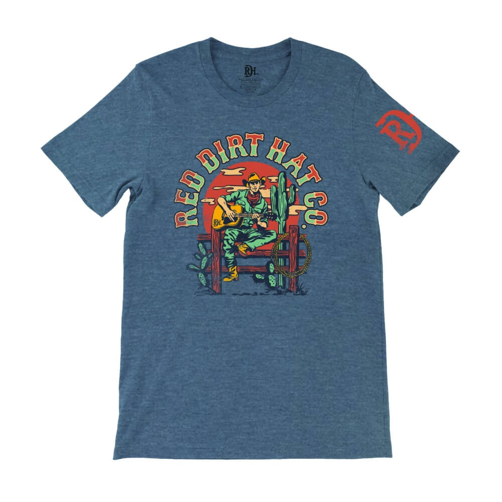 Comfy Red Dirt Mens Singing Cowboy T-Shirt. Mens heather navy t-shirt featuring the exclusive “Singing Cowboy” design, as well as the signature RDH brand on the left sleeve.