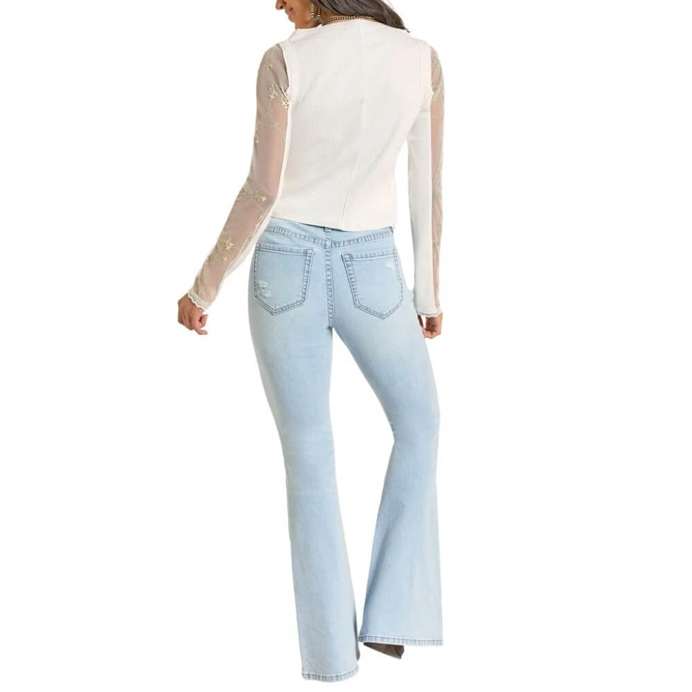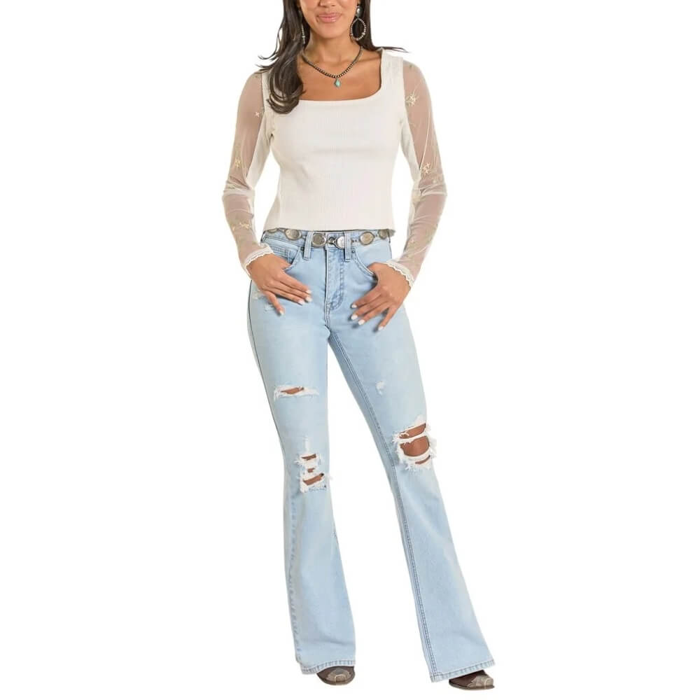 The Rock & Roll Women's Embroidered Lace Sleeve Top features an intricate embroidered design that adds a touch of elegance. Delicately crafted lace sleeves enhance its feminine style, making it a versatile option for various occasions. Designed with attention to detail, this top effortlessly blends comfort with timeless charm.