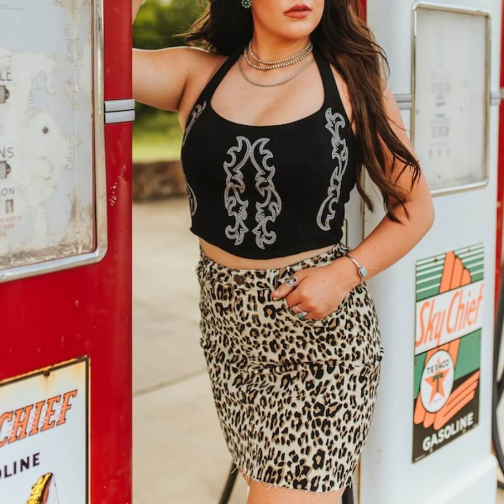 Crafted for comfort and attitude, this statement mini skirt pairs effortlessly with corset tops, fringe jackets, or graphic tees, making it a standout piece.