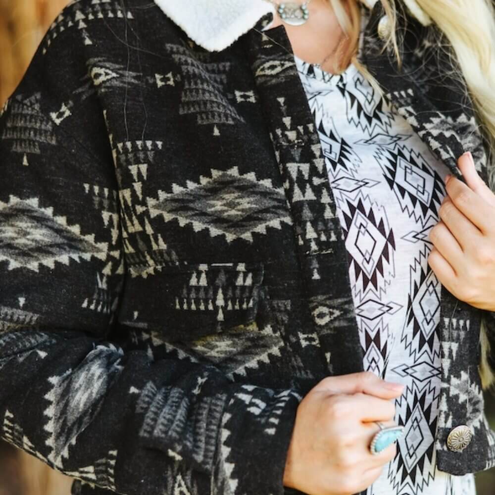 Make a bold seasonal statement with this cropped black Aztec jacket, designed for modern Western women who crave warmth without sacrificing style. The tailored silhouette hits at the waist for a flattering fit, while silver concho-style buttons and flap pockets add a classic cowboy-inspired touch.