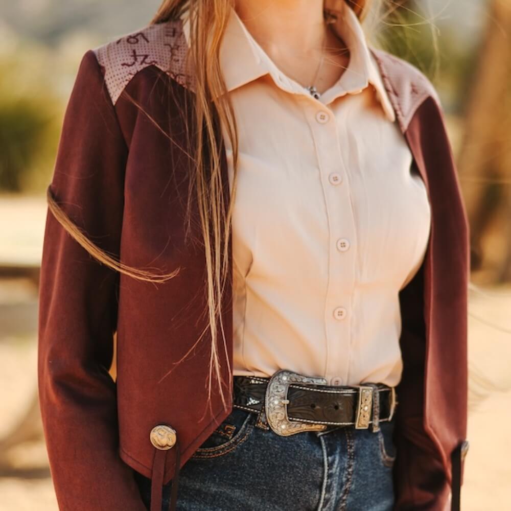 This women's western jacket features a structured yet feminine silhouette with a zip-up front, long sleeves with adjustable tie cuffs, and a unique western yoke adorned in classic ranch-style branded symbols. The rich burgundy body contrasts elegantly with the soft sand-toned shoulder detailing, capturing a bold and timeless frontier aesthetic.