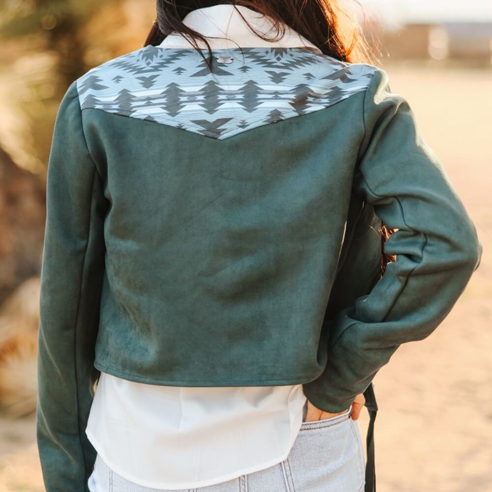 This women's western jacket features a structured yet feminine silhouette with a zip-up front, long sleeves with adjustable tie cuffs, and a unique western yoke adorned in classic ranch-style branded symbols.