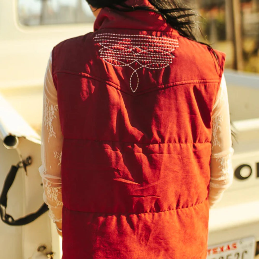 Step into bold Western comfort with this Boot Stitch Embroidered Rodeo Vest from Lucky & Blessed. Crafted for the modern cowgirl, this sleeveless vest features a rich fabric with quilted padding, delivering warmth without the bulk. A high collar adds edge and structure, while the front zip closure ensures a secure, flattering fit. The standout feature is the intricate white Western embroidery, stitched on both the chest pocket and across the back yoke