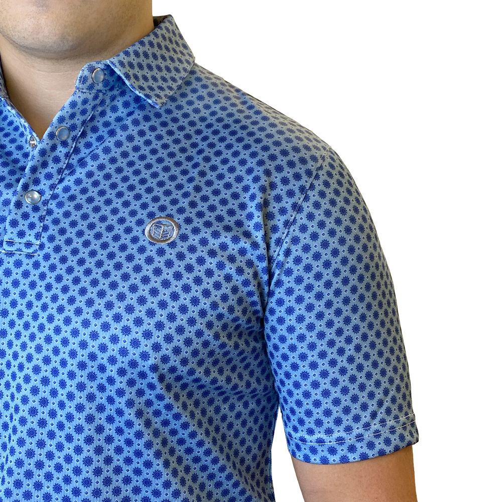 This mens short-sleeve polo delivers a sharp Western-inspired look with everyday comfort. Designed in a Bright Blue Geo tone, it features a bold woven geometric pattern across the chest and sleeves in contrasting blue for standout style. The classic three-button placket and structured collar provide a polished finish, while the soft, breathable fabric makes it ideal for all-day wear.