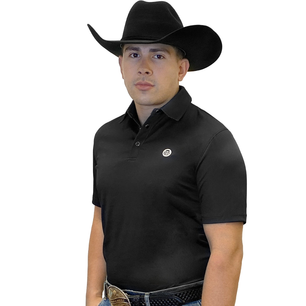 This classic black polo delivers a clean, polished look with a subtle Western edge. Designed for everyday wear, it offers comfortable short sleeves and a smooth solid finish that pairs easily with jeans or dress pants. A neatly embroidered logo on the left chest adds a refined touch without overpowering the minimalist design, making this polo a versatile choice for work, casual outings, or nights out.