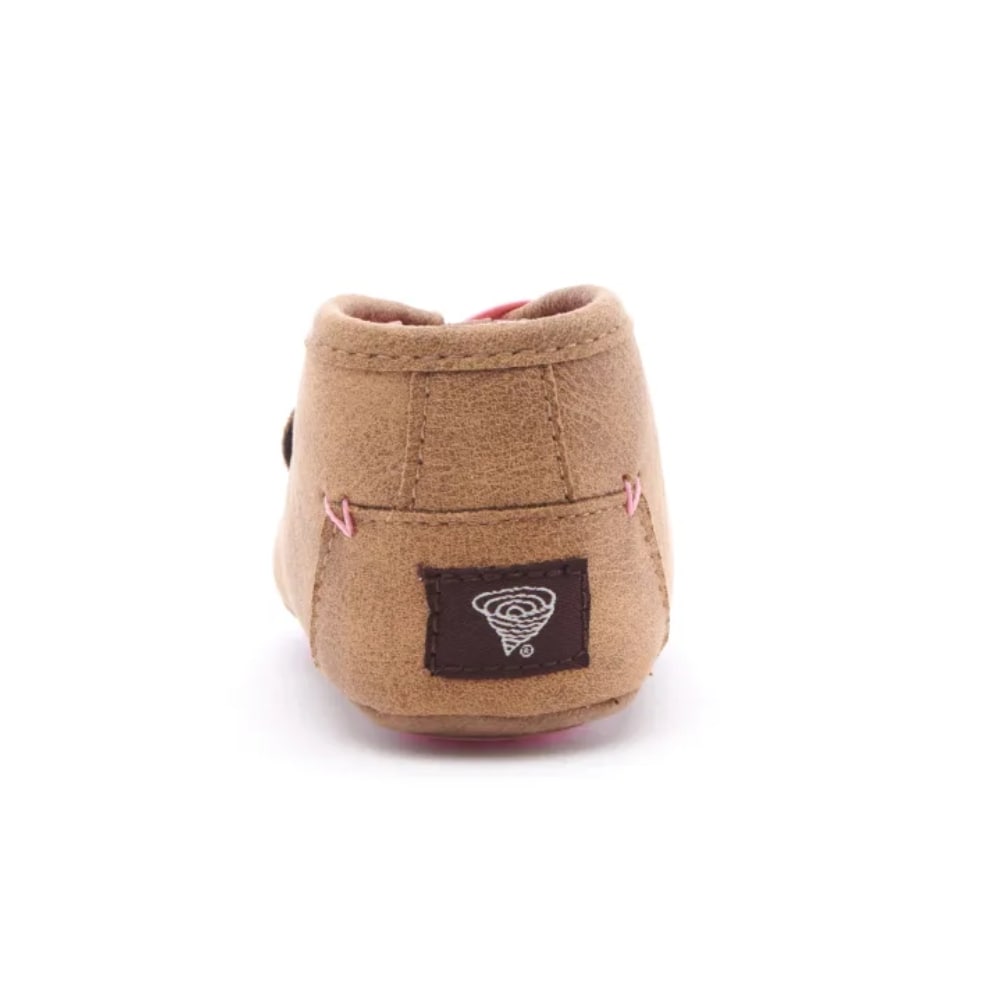 Twister presents these brown and pink glitter moc shoes. These shoes have pink elastic laces, a moc toe and are a fabric material.