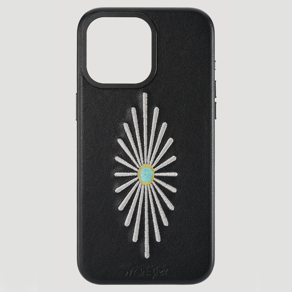 Authentic Wrangler iPhone 15 Pro Max Leather Case. This fully wrapped black embroidered phone case is infused with Wrangler's signature Western flair and is perfect for the iPhone.