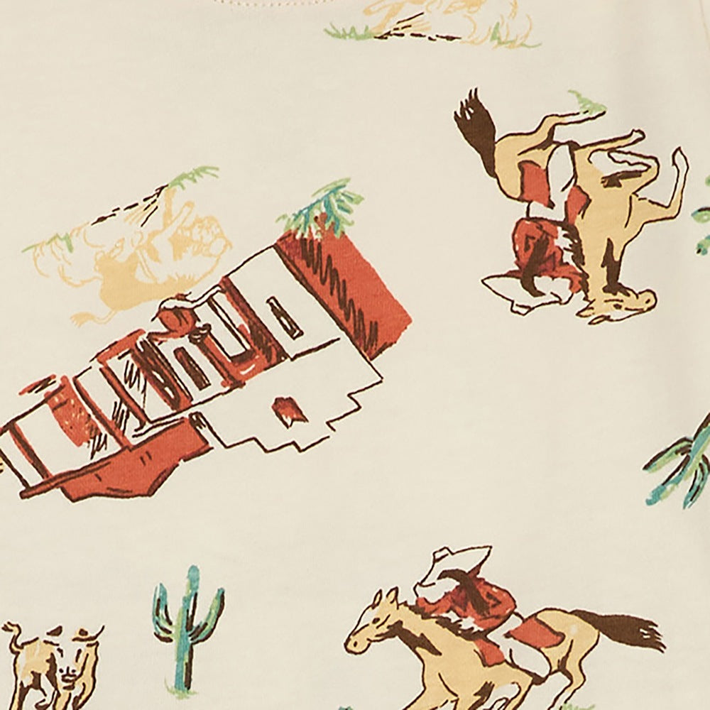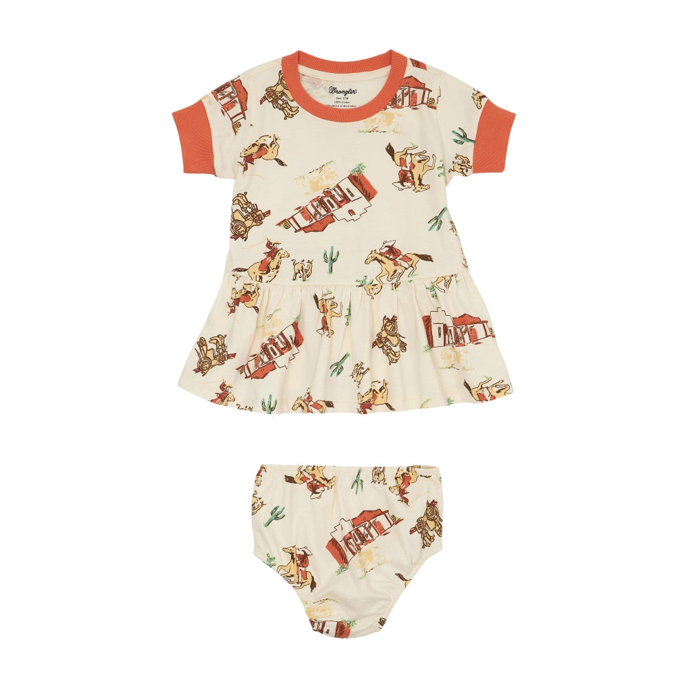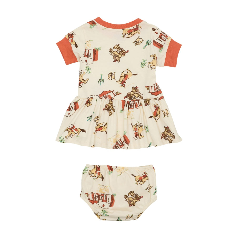 Picture-perfect and ready for play, Wrangler's Little Girl’s Western Print Drop Waist Dress is a dream come true for the cowgirl in training. It’s crafted from 100% cotton to keep her comfortable. This one-and-done outfit includes a short-sleeve dress with a dropped waist and a matching diaper cover to complete the look. Plus, it’s covered in a vintage-inspired print full of cowboys, saddles, and other Western motifs.