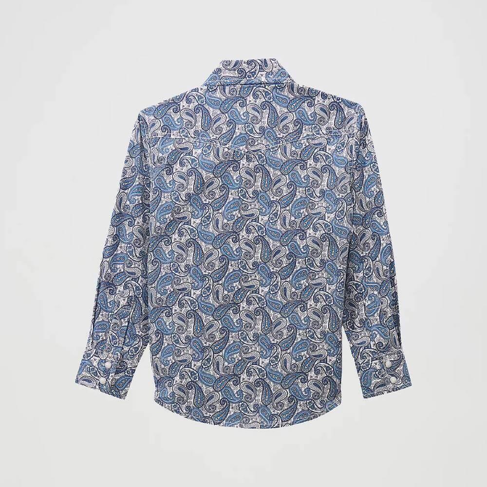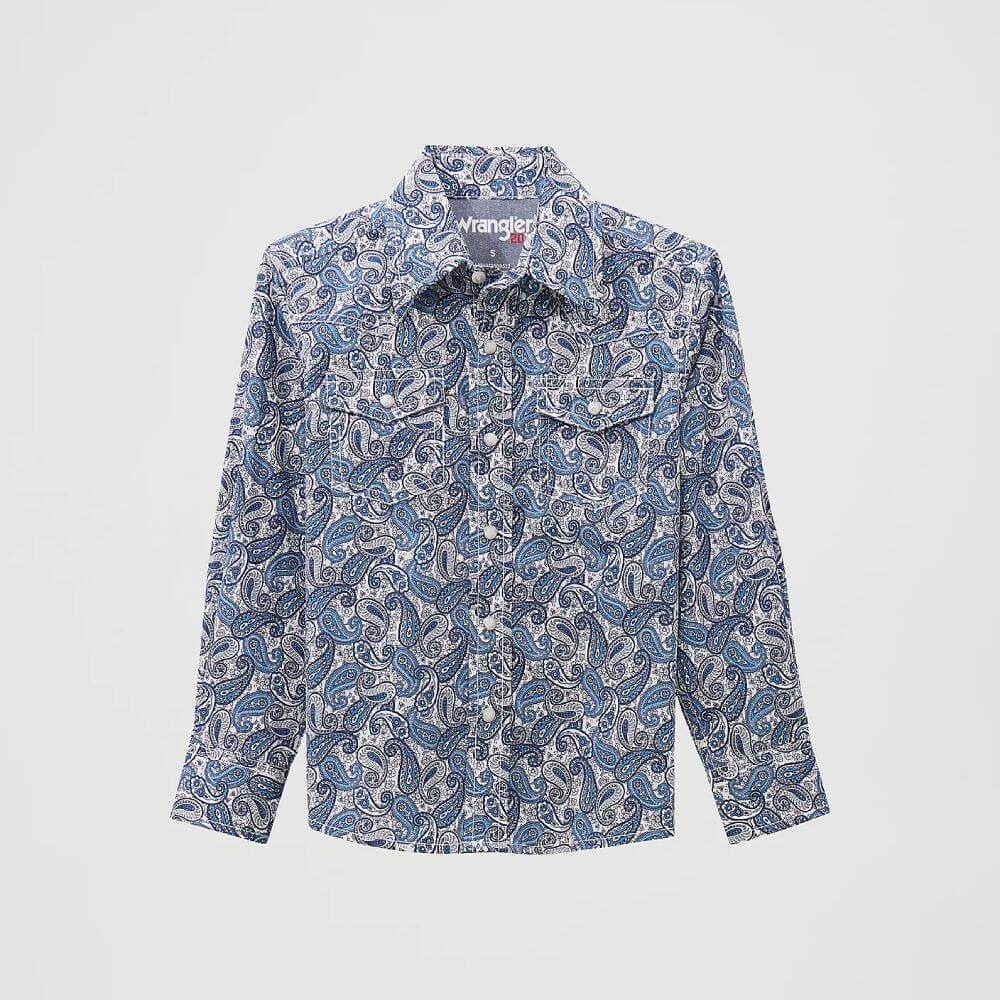 Handsome Wrangler Boys 20X® Advanced Comfort Western Shirt. Your little man will always look cool in this rough and ready long sleeve print shirt. The Western yokes provide a touch of authentic style, while the snap front and cuffs finish off the look. Incredibly comfortable, he'll look sharp but never miss a minute of the fun.