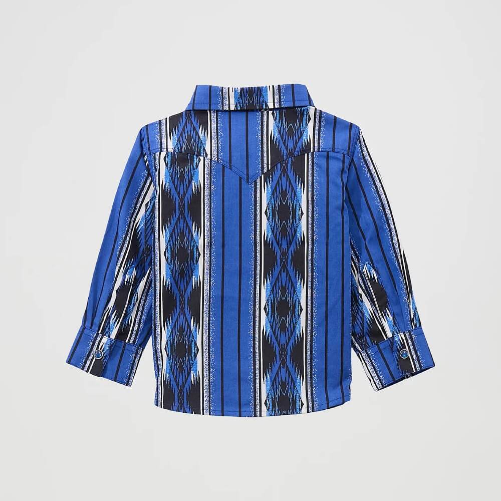 Handsome Wrangler Boys Checotah Western Shirt. It's never too soon to get your little cowboy dressed up in your favorite Western styles. This Wrangler® baby and toddler boys' Western shirt combines all the classic features you know and love with a comfy cotton silhouette perfect for your little one. The shirt has Western-style yokes and flap chest pockets, Wrangler’s signature 'W' stitching, iconic pearl snap buttons, and a striking southwestern print. Dress him up in this stylish cowboy shirt and add a pair of baby boys' Wrangler jeans for the ultimate in kids' Western Wear.